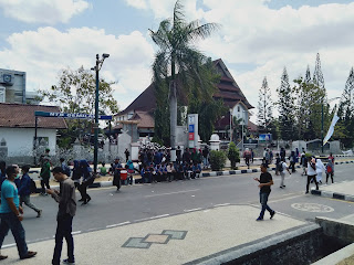 | Jalan Udayana depan kantor DPRD NTB sepi, terlihat kerumunan Mahasiswa yang sedang menunggu masa aksi lainnya sholat. |