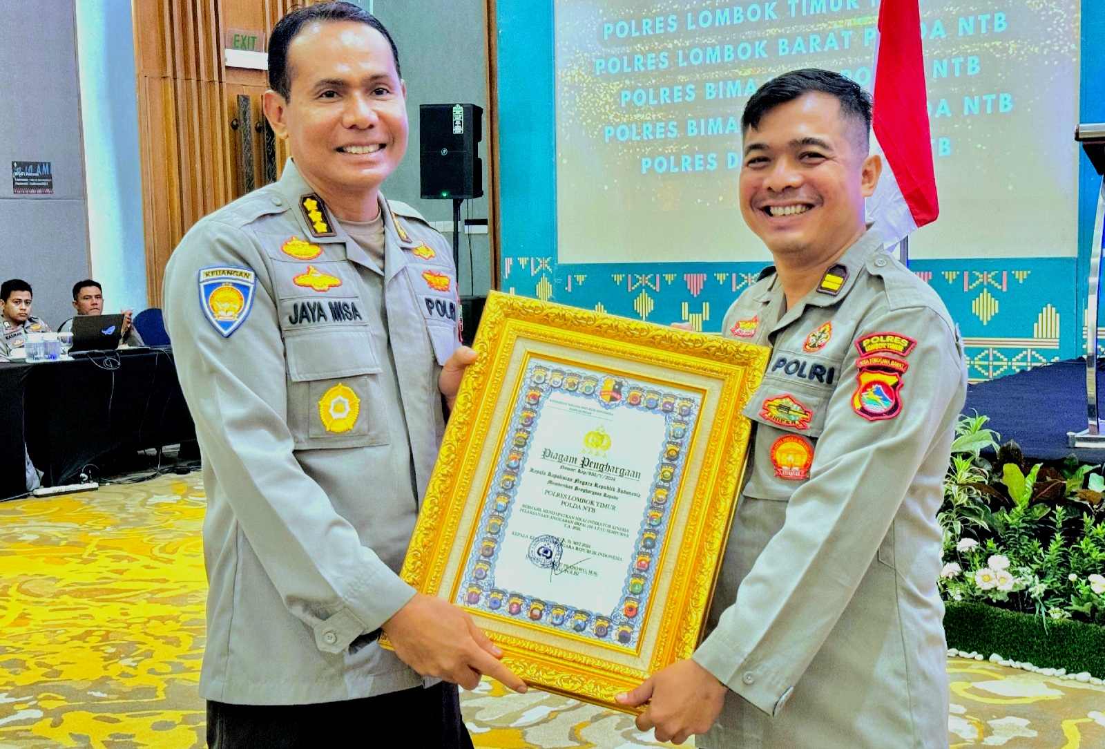 Piagam penghargaan diserahkan oleh Kabidkeu Polda NTB Kombes Pol. Ignasius Jaya Misa, SE, MM. kepada Kasi Keu Polres Lombok Timur IPTU I Putu Satya Dharma, SH., MH. yang ditunjuk mewakili Kapolres Lotim untuk menerima penghargaan ini.