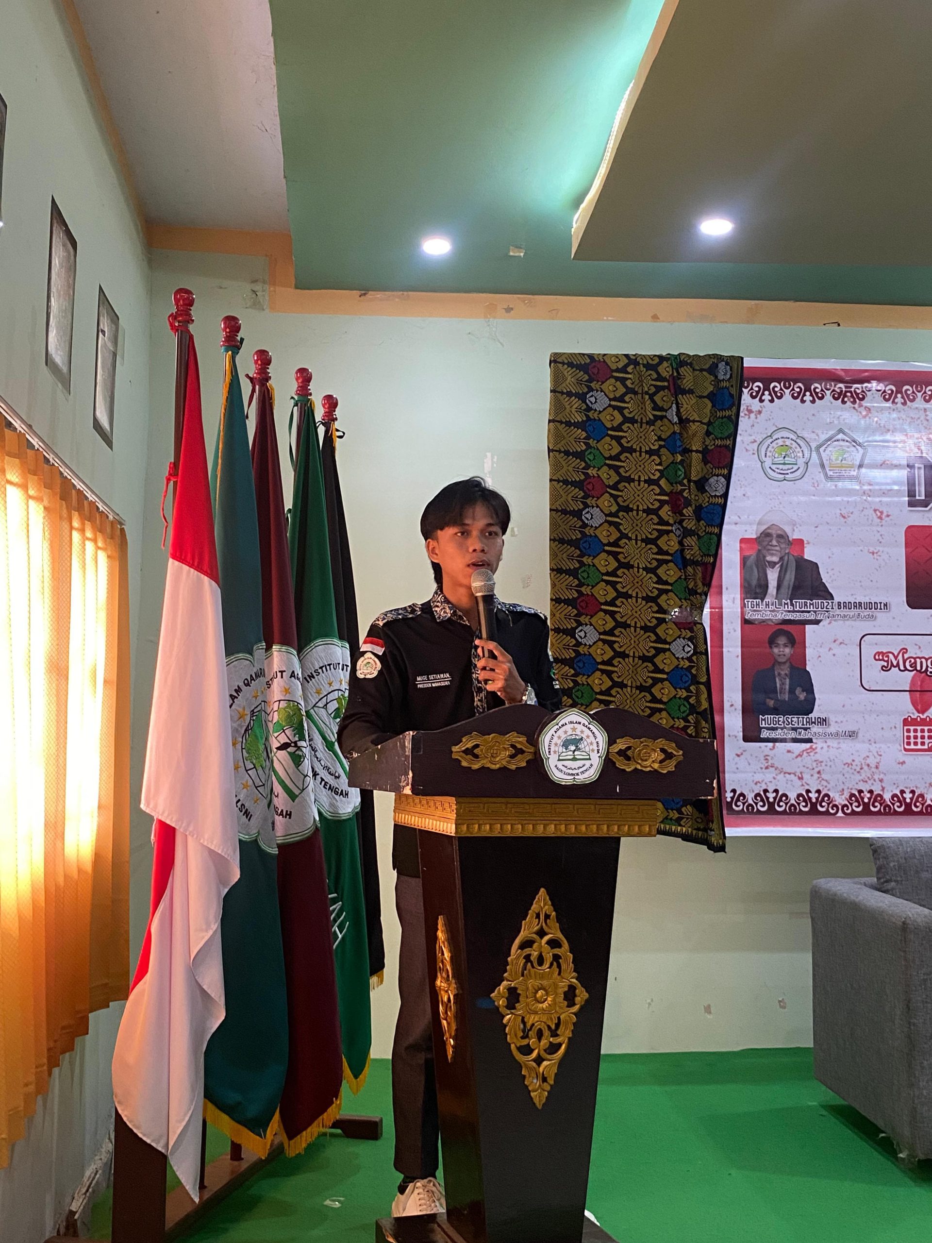 Presiden Mahasiswa IAIQH Bagu, Muge Setiawan, dalam sambutannya menegaskan pentingnya mahasiswa untuk terus berkembang dan adaptif.