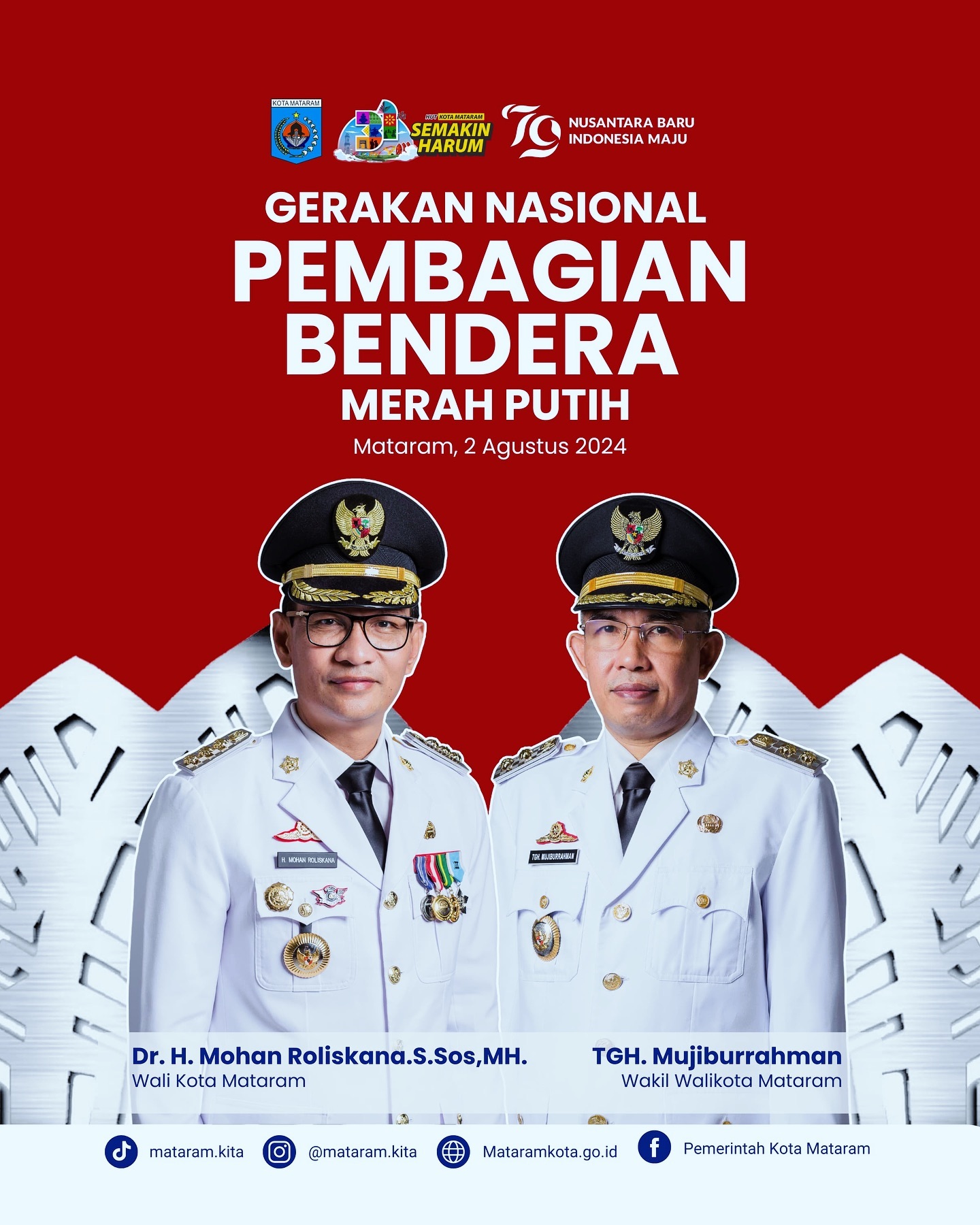 Dalam rangka menyambut Hari Ulang Tahun ke-31 Kota Mataram, Pemerintah Kota Mataram menggelar Gerakan Nasional Pembagian Bendera Merah Putih Tahun 2024. Kegiatan ini akan dilaksanakan pada Jumat, 2 Agustus 2024, pukul 06.30 Wita dengan rute start dari Lapangan Sangkareang menuju Teras Udayana. Seluruh peserta diharapkan mengenakan pakaian bernuansa merah putih.