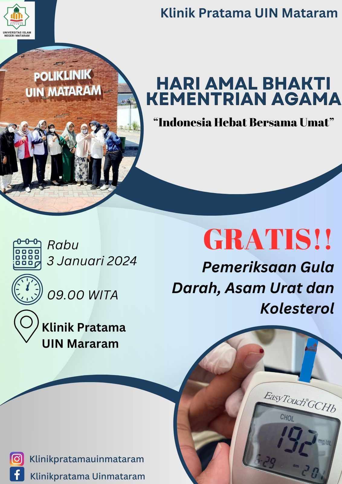 Klinik Pratama UIN Mataram memberikan pelayanan kesehatan gratis, khususnya pemeriksaan gula darah, asam urat, dan kolesterol menggunakan alat Easy Touch GCHB. Masyarakat dapat memanfaatkan kesempatan ini untuk memeriksakan kondisi kesehatan mereka tanpa dipungut biaya.