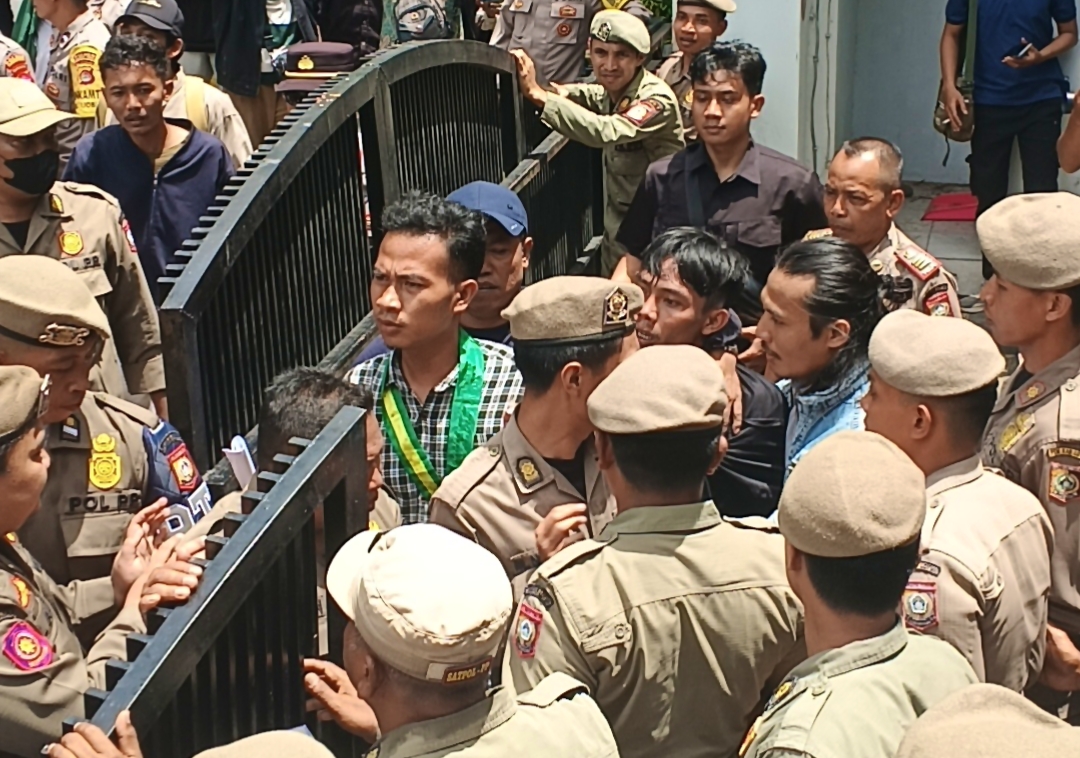 Masa aksi akhirnya memaksa masuk setelah sekian jam menunggu Bupati keluar namun tidak kunjung di temui dan akhirnya masa aksi memaksa masuk sehingga terjadi saling dorong dengan aparat kepolisian dan Pol-PP.