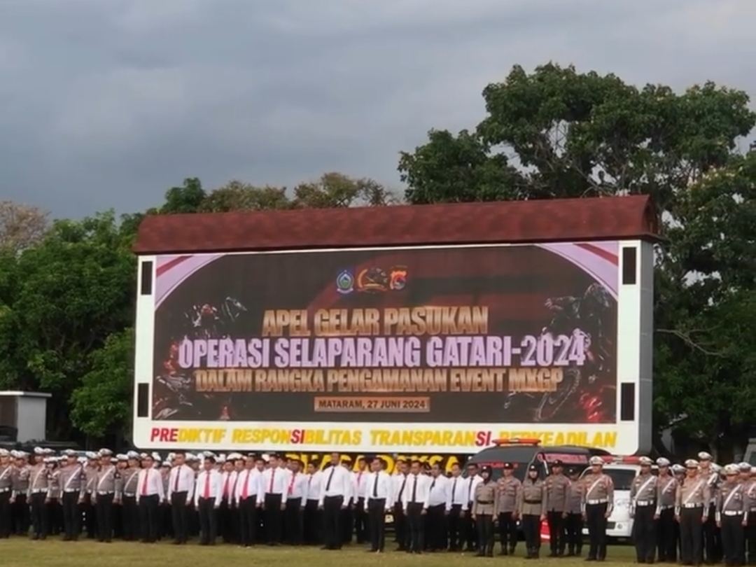 Mataram, NTB – Polda Nusa Tenggara Barat (NTB) menggelar Apel Gelar Pasukan Ops Selaparang Gatarin 2024 di Lapangan Bhara Daksa Polda NTB, Kamis (27/06/2024). Apel ini bertujuan untuk memastikan kesiapan pengamanan event MXGP Lombok 2024 yang akan berlangsung pada 29-30 Juni dan 6-7 Juli 2024.
