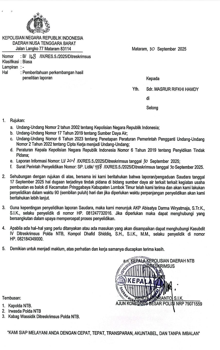 SP2HP dengan nomor: B/168/IX/RES.5.2/2025/Ditreskrimsus, tertanggal 30 September 2025, ditujukan kepada pelapor, Masrur Rifki Hamdy di Selong, yang merupakan bagian dari tindak lanjut laporan polisi tanggal 17 September 2025. Surat tersebut secara resmi mengonfirmasi bahwa dugaan tindak pidana di bidang sumber daya air terkait kegiatan pertama pembuatan es balok di Kecamatan Pringgabaya, Lombok Timur, telah diterima dan akan ditindaklanjuti.