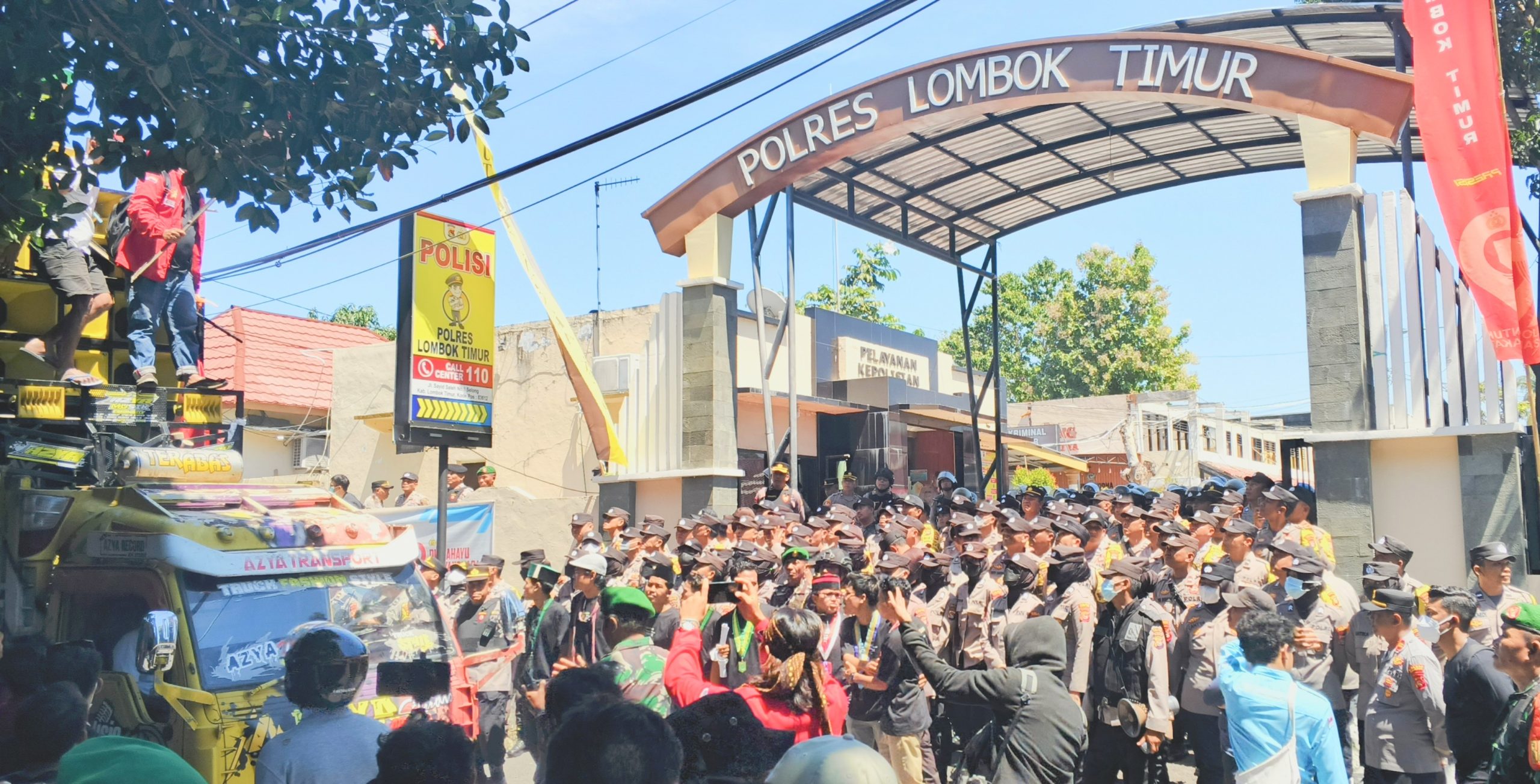 ‎‎Sebelumnya di depan kantor Polres Lombok Timur di padati oleh masyarakat setempat yang membuat pihak kepolisian memberikan aba-aba untuk meminta masyarakat kembali atau mundur.