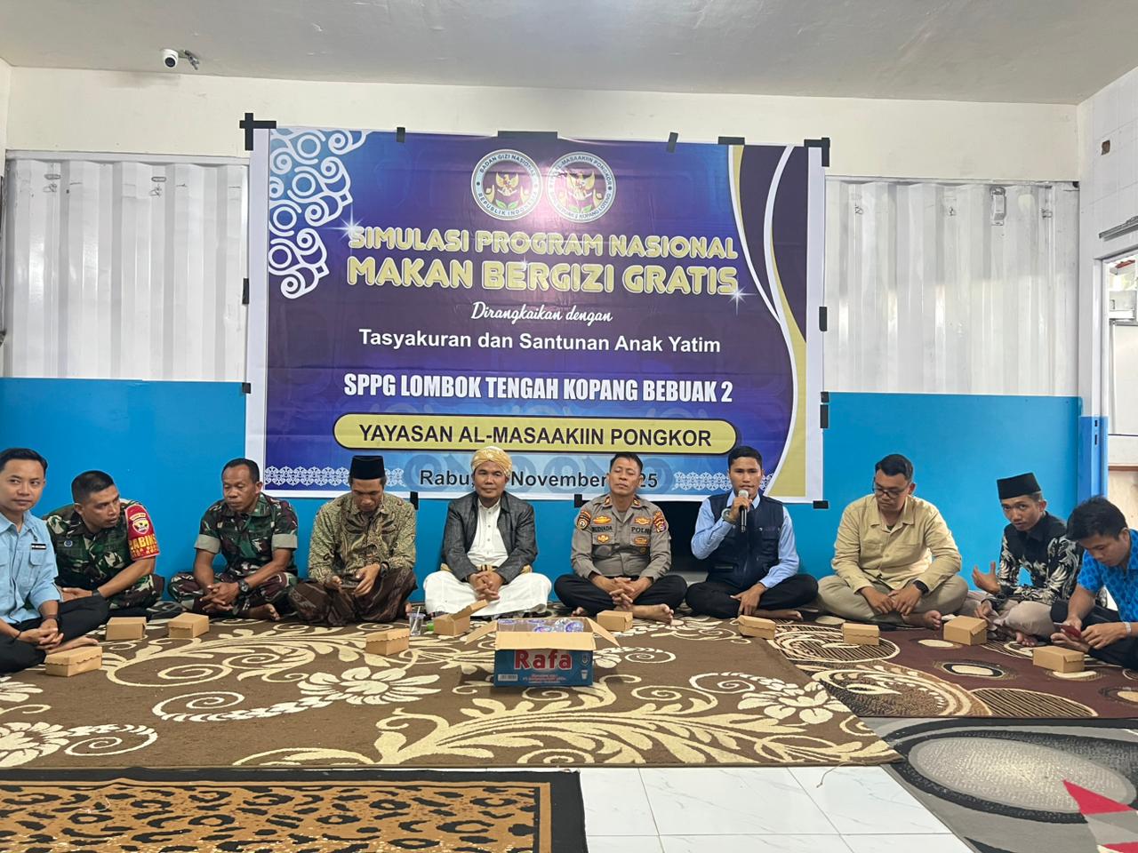 Lombok Tengah | Lombok fokus — Satuan Pelayanan Pemenuhan Gizi (SPPG) Bebuak Kopang 2 Pongkor menggelar simulasi Program Makan Bergizi Gratis (MBG) yang dirangkaikan dengan tasyakuran dan santunan anak yatim, Rabu (26/11). Kegiatan ini menjadi tahapan awal sebelum program nasional di bawah Badan Gizi Nasional (BGN) resmi dijalankan di Dapur tersebut.