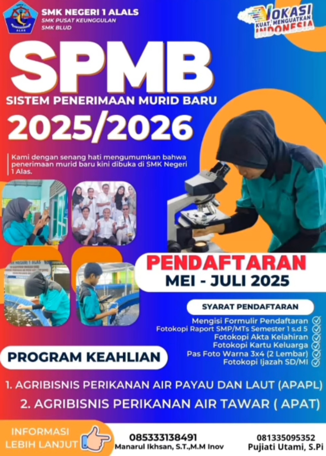 Alas – Sekolah Menengah Kejuruan Negeri (SMKN) 1 Alas secara resmi mengumumkan pembukaan pendaftaran Sistem Penerimaan Murid Baru (SPMB) untuk tahun ajaran 2025/2026. Proses pendaftaran akan berlangsung mulai bulan Mei hingga Juli 2025, memberikan kesempatan luas bagi para calon peserta didik yang ingin mengembangkan potensi di bidang kejuruan.