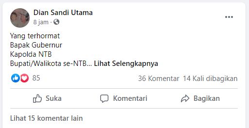 Lombok Fokus – Postingan Dian Sandi Utama viral di media sosial Facebook, surat terbuka yang ia tujukan ke Gubernur NTB banyak dapat respond dan komentar dari Netizen.